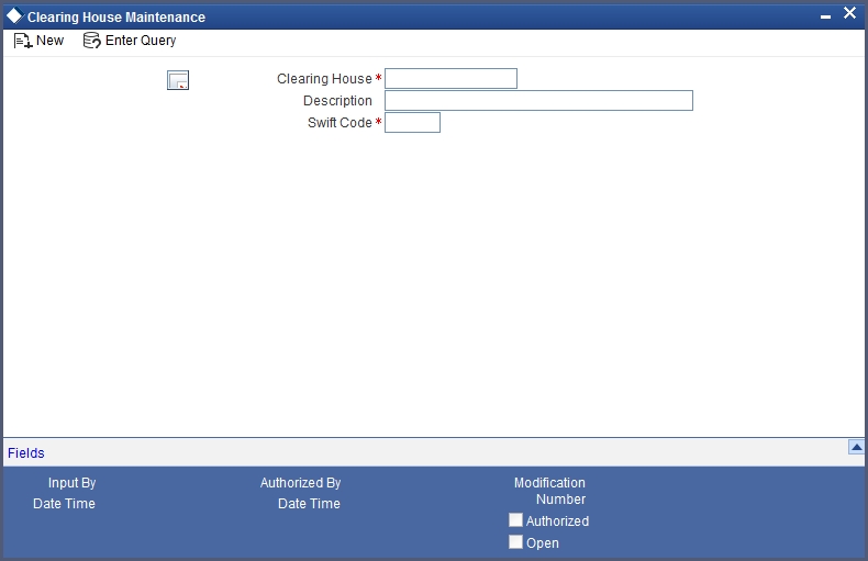 If you are maintaining details of a new financial center choose New from the Actions Menu or click ‘New’ icon from the tool bar. The ‘Clearing House Maintenance’ screen will be displayed without any details.
