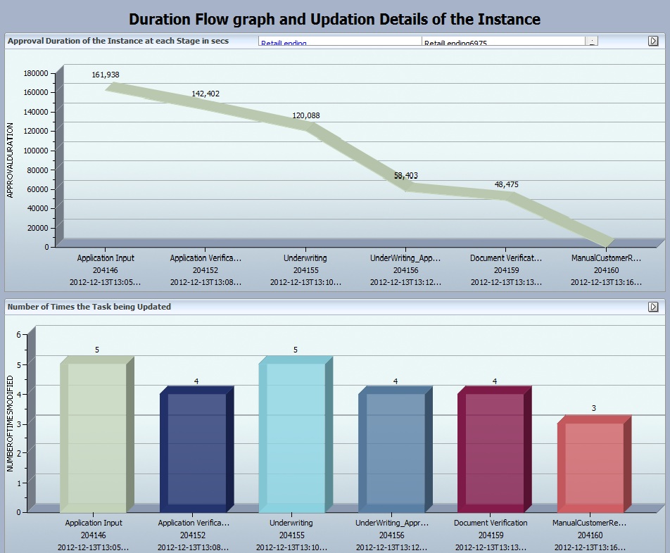 You can view the duration flow graph by clicking on the specific instance.The duration flow graph displays the approval duration and the number of times the tasks are updated.