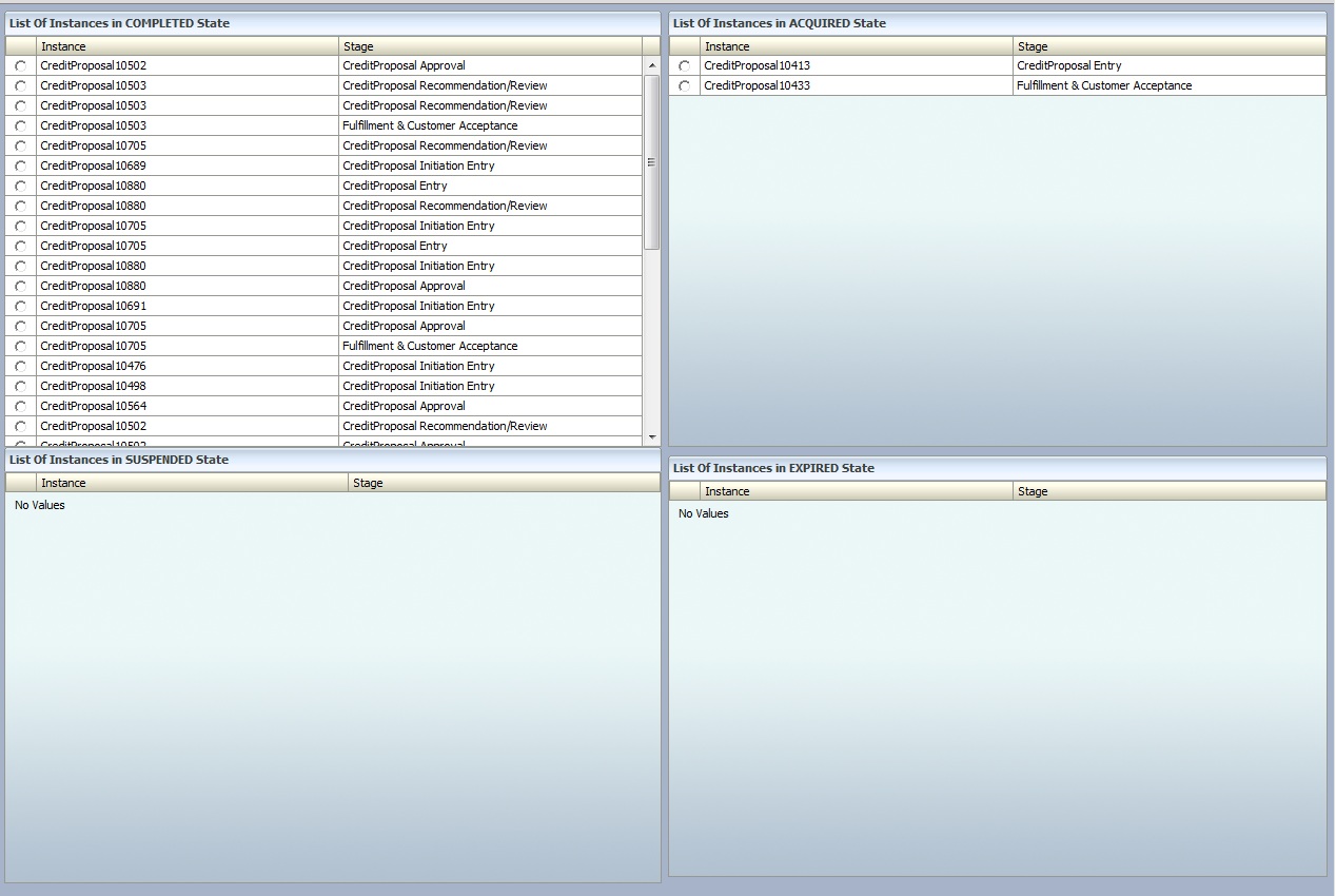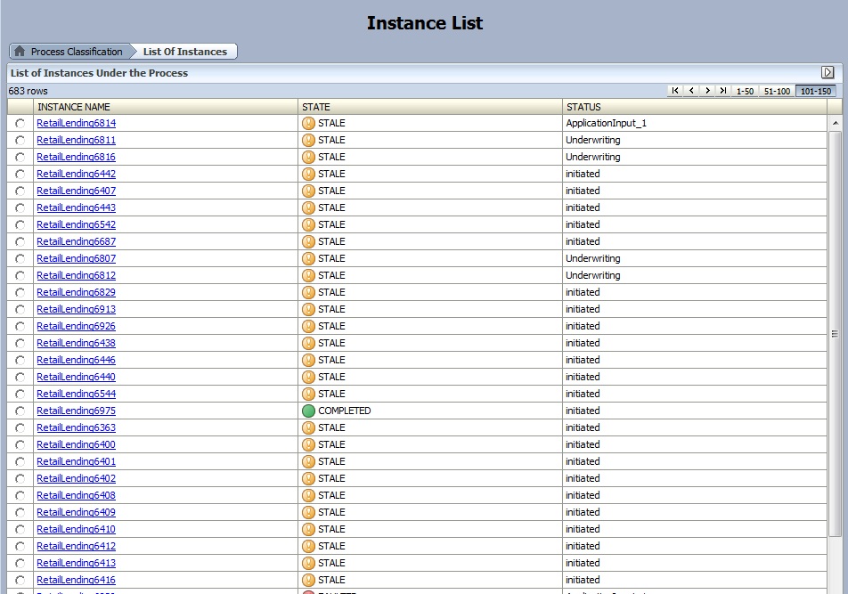 You can invoke the report with the list of instances in a process with its state and status by clicking on the specific process.