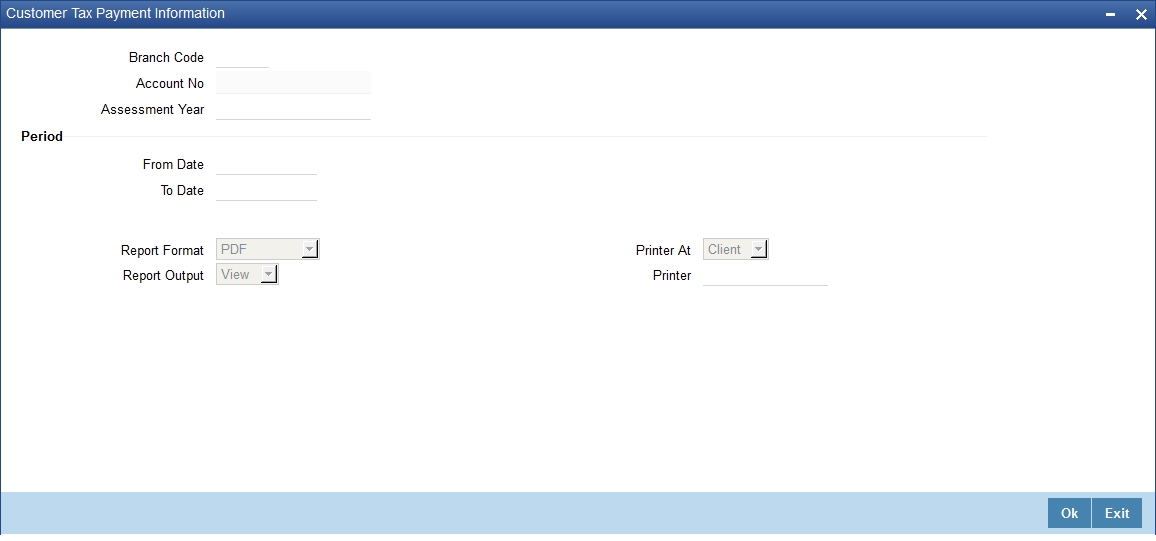 You can generate and view customer tax payment reports using ‘Customer Tax Payment’ screen. To invoke the screen, type ‘IFRTXPM’ in the field at the top right corner of the Application toolbar and click the adjoining arrow button.