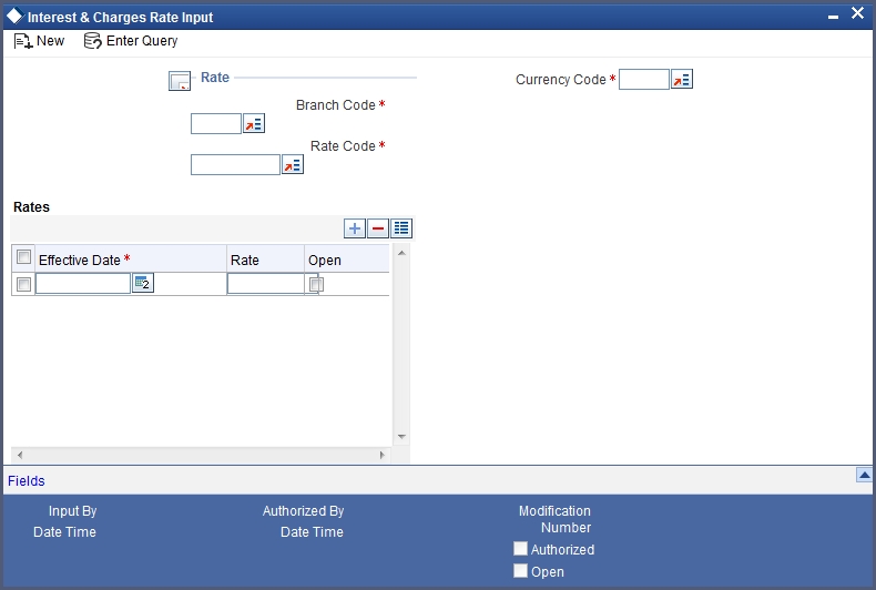 For the aforesaid rate codes, you need to maintain rates and effective dates in the ‘Interest and Charges Rate Input’ screen. You can invoke the ‘Interest and Charges Rate Input’ screen by typing ‘ICDRATES’ in the field at the top right corner of the Application tool bar and clicking the adjoining arrow button.