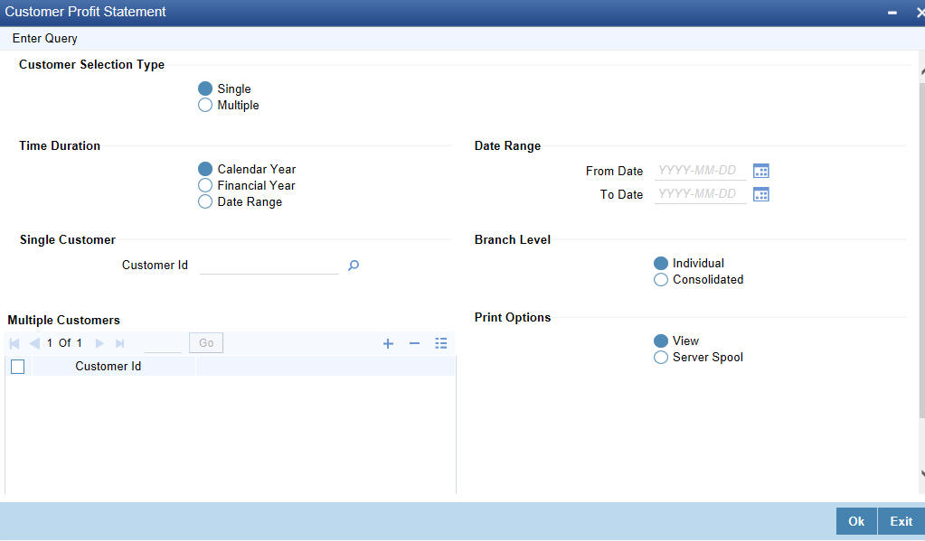 Specify the customer ID for which you want to generate a profit statement from the adjoining option list.