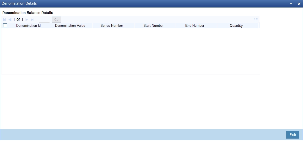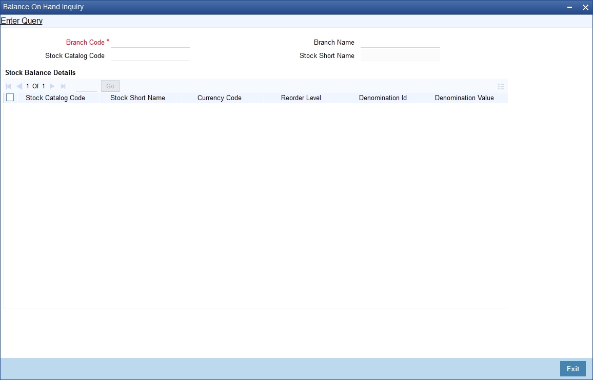 You can use the ‘Balance on Hand Inquiry’ screen to view the current balance stock in a denominations and serial numbers wise break down. The query results are based on the requesting Branch.