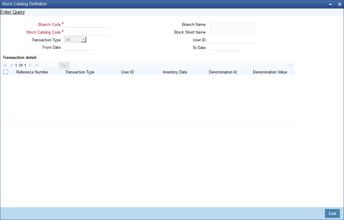 The query results will be for the requesting branch code. This function allows inquiry operation only. The respective branch’s current balance for each type of stock catalog will be displayed with the breakdown of denominations and value for each denomination.