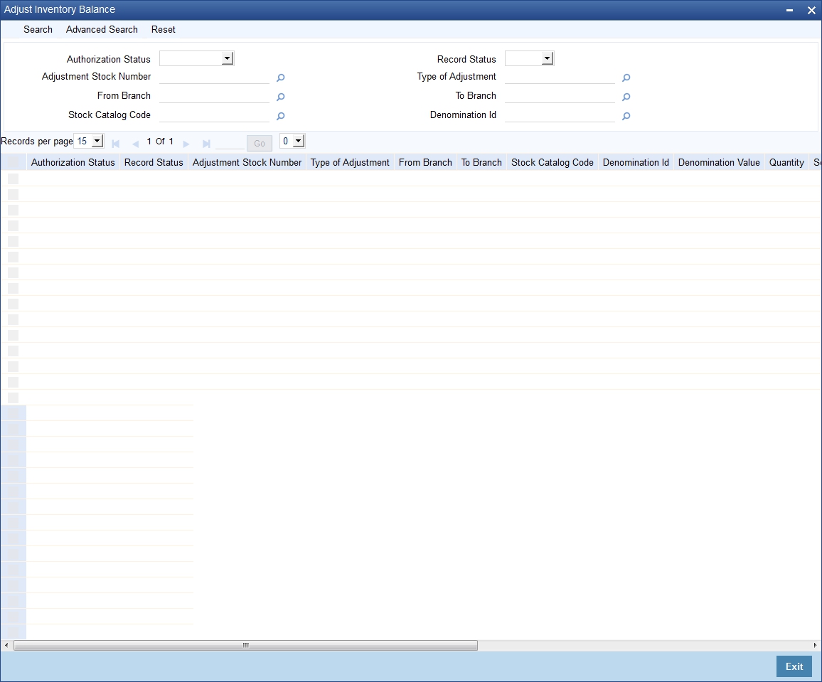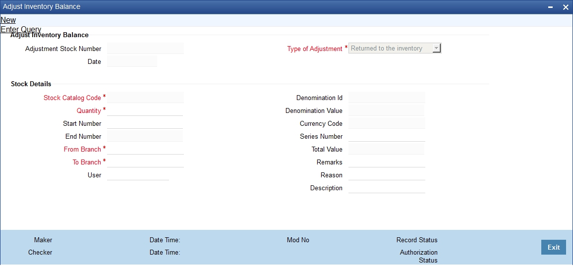 You can use the ‘Adjust Inventory Balance’ screen for any adjustments to be made after an issue or receipt of inventory. These adjustments may be needed when returning certain items from the vendor or when the bank’s departments return them to the main inventory control.