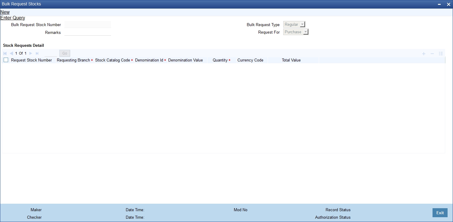 You can use the ‘Bulk Request Stocks’ screen for recording multiple requests at the same time. These requests can be for different stocks, denomination and requesting branch.