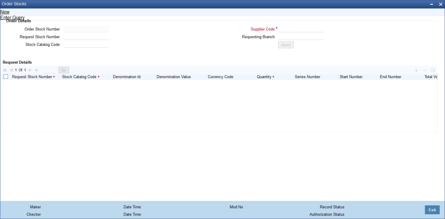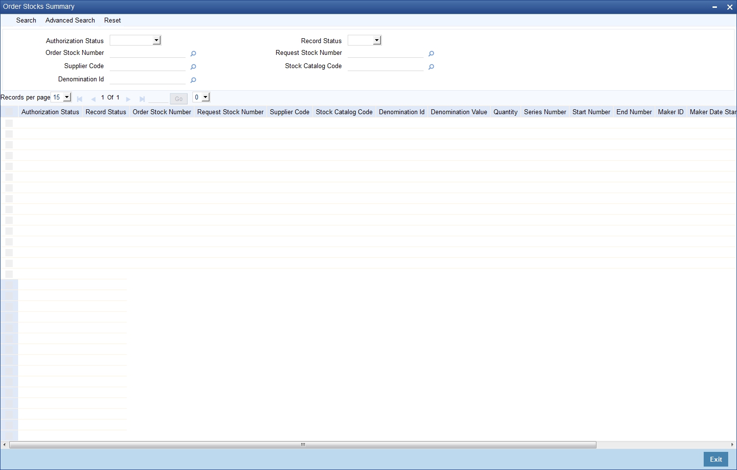 You can use the ‘Order Stocks Summary’ screen to query for Order Stocks records, by specifying the following parameters: