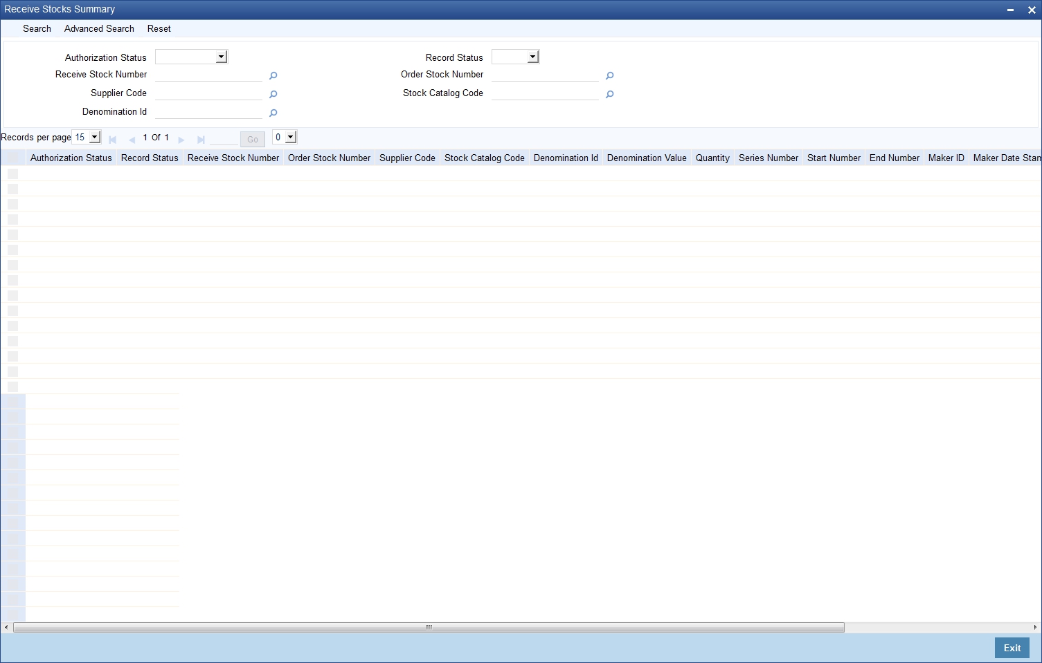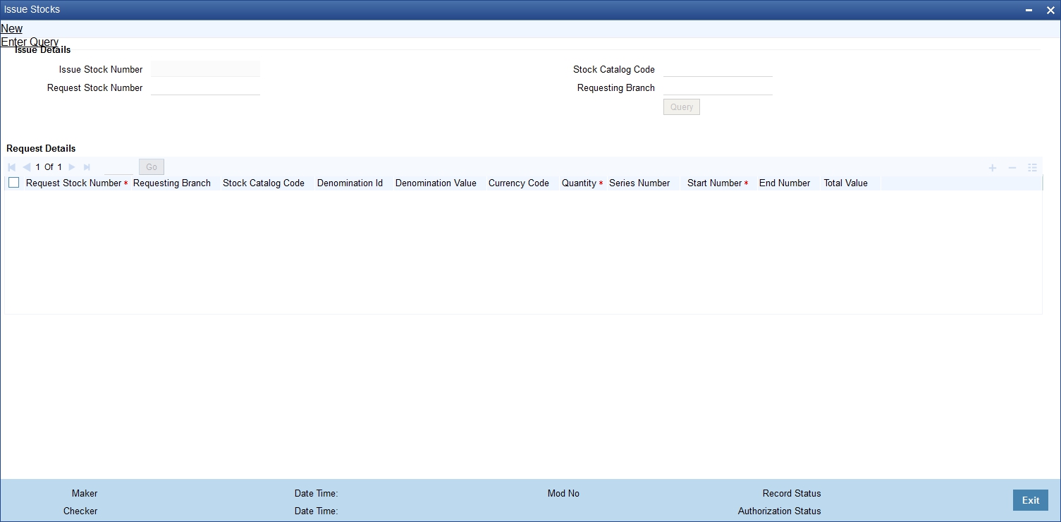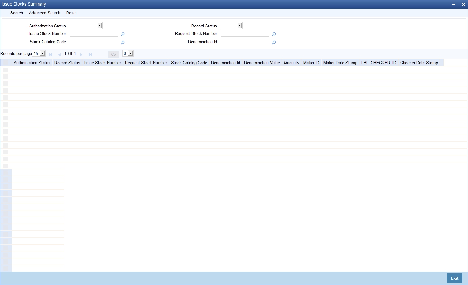 You can use the ‘Issue Stocks Summary’ screen to query of Issue Stocks records, by specifying the following parameters:
