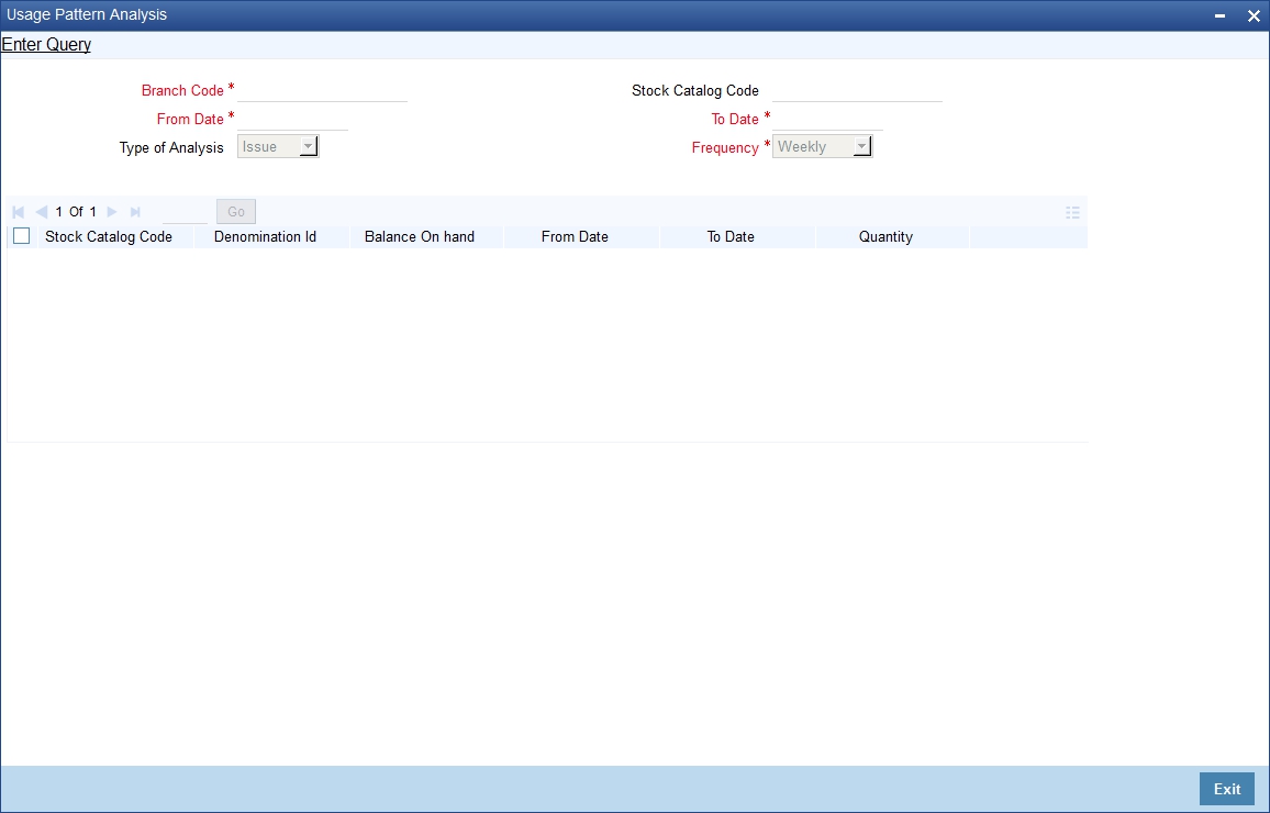 You can use the ‘Usage Pattern Analysis’ screen to query and display the details of stock usage across periods.