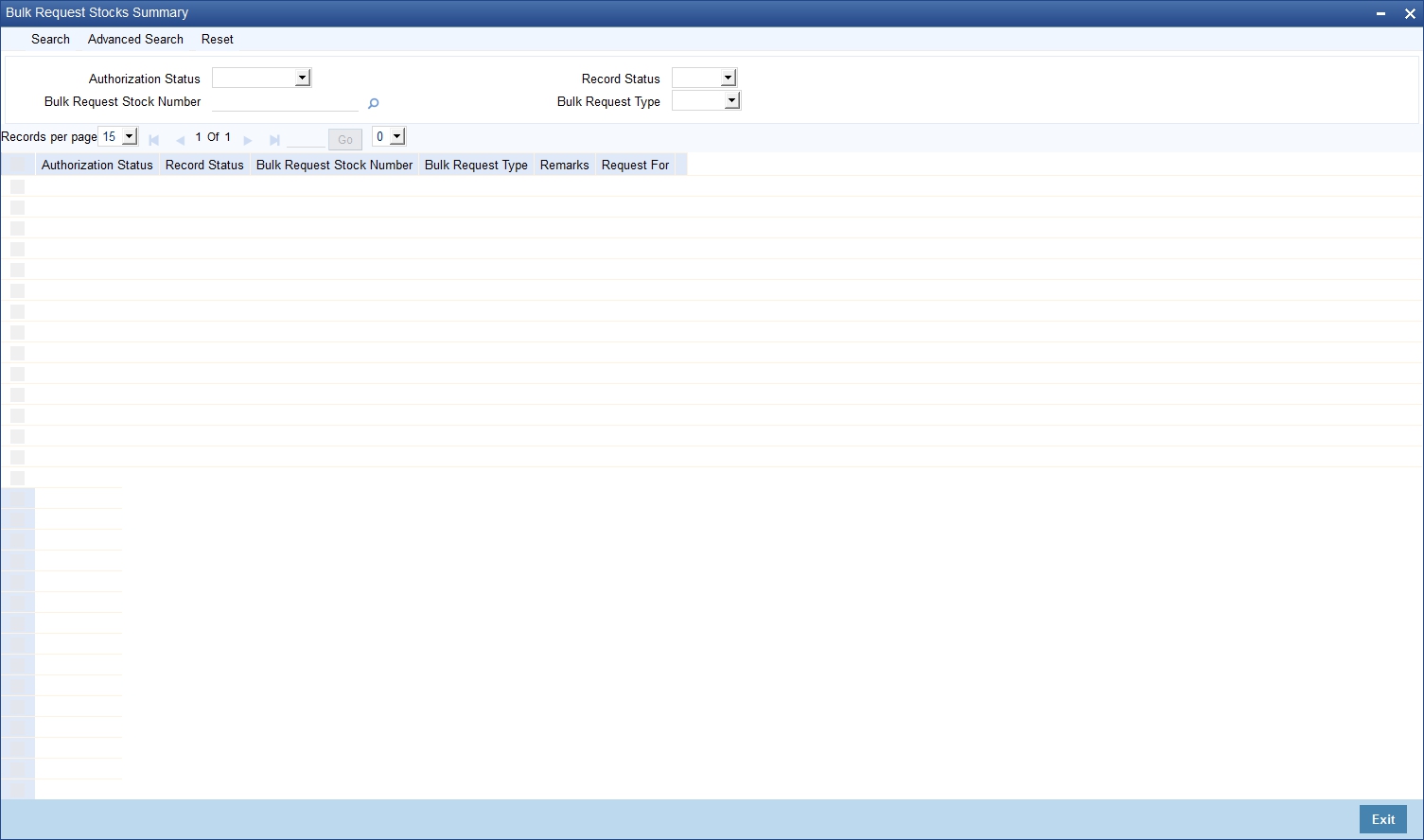 You can use the ‘Bulk Request for Stocks - Summary’ screen to query for Bulk Request records, by specifying the following parameters: