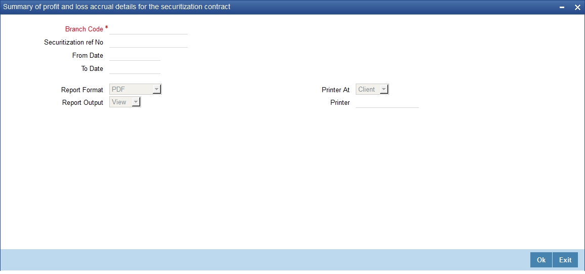 You can manually generate a report that displays the summary of profit / loss accrual details for the securitization contract in the ‘Summary of profit and loss accrual details for the Islamic securitization contract’ screen. You can invoke this report screen by typing ‘IZRPLACR’ in the field at the top right corner of the Application Toolbar and clicking the adjoining arrow button.
