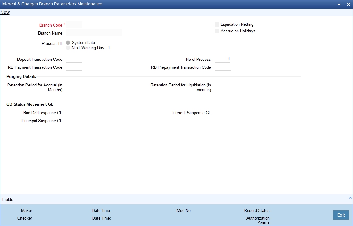 You can use the ‘Interest & Charges Branch Parameters’ screen for maintaining parameters related to Interest and Charges. These parameters can be maintained for each branch of your bank. You can invoke the ‘Interest & Charges Branch Parameters’ screen by also entering ‘ICDBRMNT’ in the field at the top right corner of the Application toolbar and clicking the adjoining arrow button.