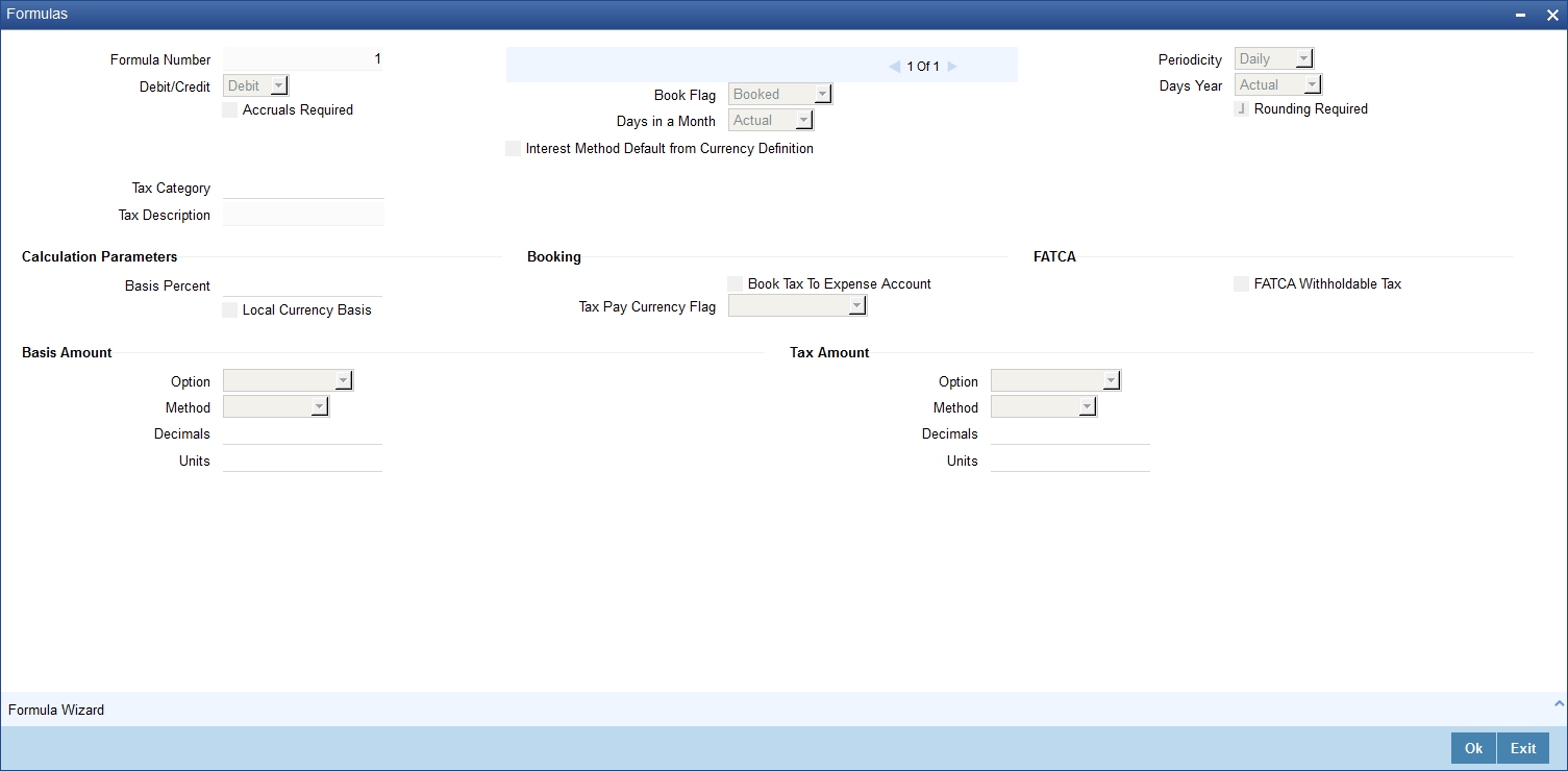 If the formula that you are creating is a tax formula, you have to specify if the tax amount would be borne by the customer or the bank. For example, if the tax on the credit interest that you pay your customer is borne by the customer, you need to indicate this here. If, on the other hand, you charge a customer interest on the debit balance and bear the tax on your income, you should indicate that the bank would bear the tax. In either case, when you have to pay tax ultimately, one entry would involve the Tax Payable GL. The accounting Role, in both cases would be ‘Tax’. Choose the GL/SL head depending on whether the customer or the bank bears the tax.