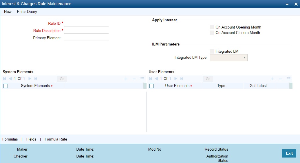 Using the SDEs and the UDEs that you have specified for a Rule, you can calculate interest. You have to specify the method for calculating interest in the form of formulae. Using the SDEs and the UDEs you can create any number of formulae for a Rule. Click ‘Formulas’ button to invoke ‘Formulas’ screen.I