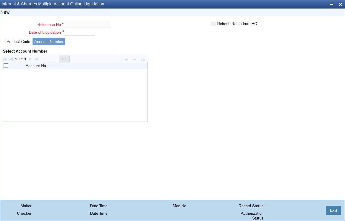 Click ‘Account Number’ tab in the ‘Interest and Charges Multiple Account Online Liquidation’ screen to get below given screen: