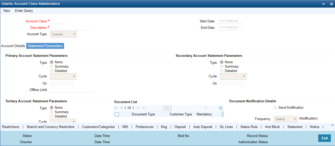 In the ‘Islamic Account Class Maintenance’ screen, where you open Islamic deposit accounts for the customers of your bank, each customer account is linked to an Islamic deposit account class, and the attributes defined for the account class are by default applicable to the customer account. For instance, if the frequency of account statement generation has been defined as daily for Islamic account class, the system generates statements for all accounts under this class on a daily basis. However, some of the parameters defined for the account class, can be revised at the account level for any of the accounts linked to the class. Account level parameters will supersede those defined for the account class.