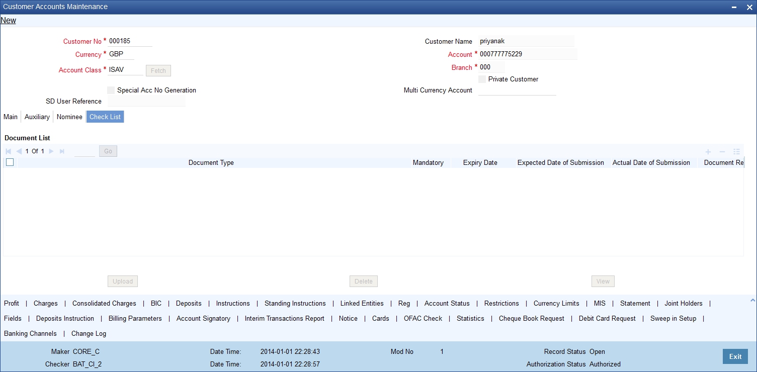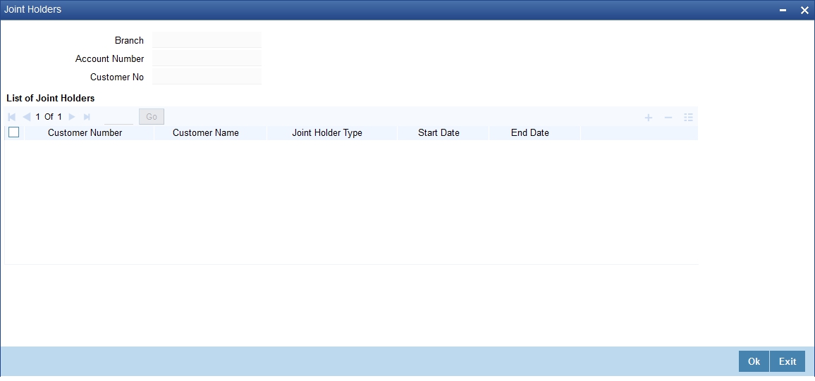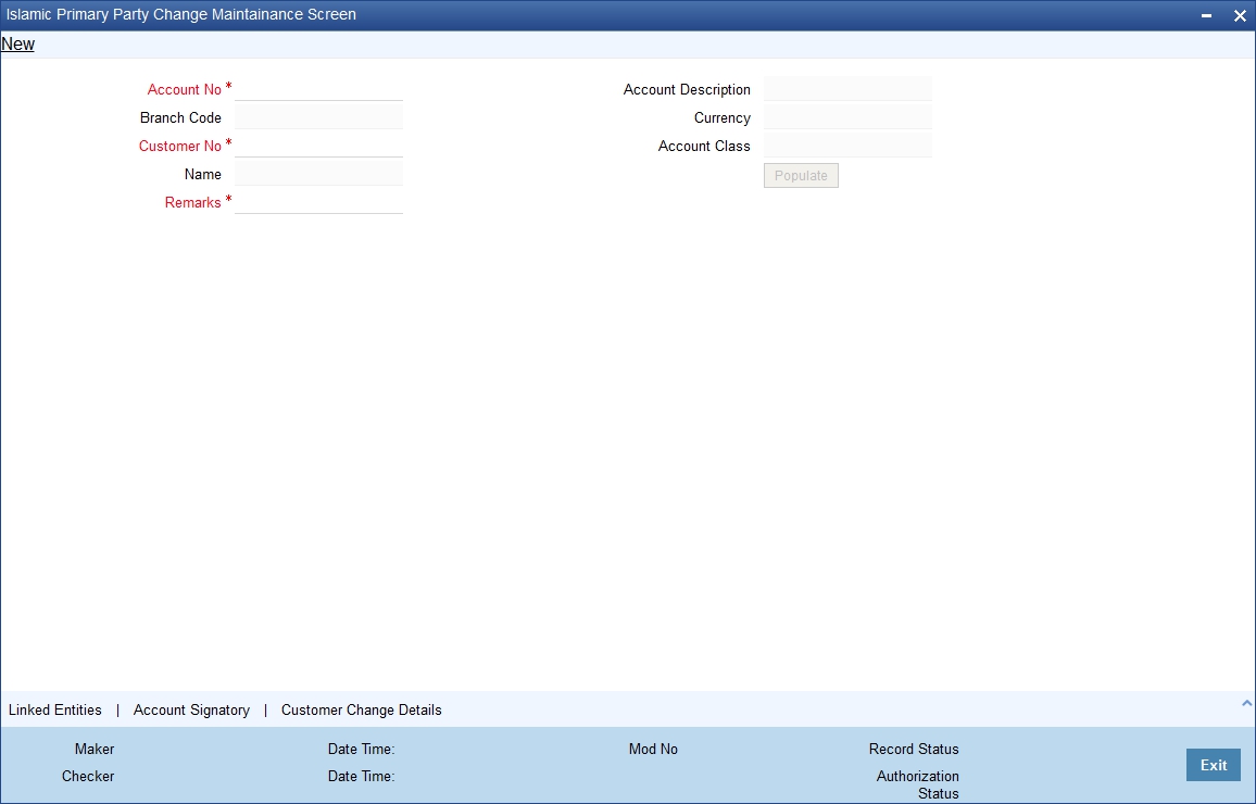 Once you have selected the customer number, click ‘Populate’ button. The system will update the ‘Account Signatory’ and ‘Linked Entities’ details based on the changed customer number. If you do not click the ‘Populate’ button, on saving the record, the system displays an error message.
