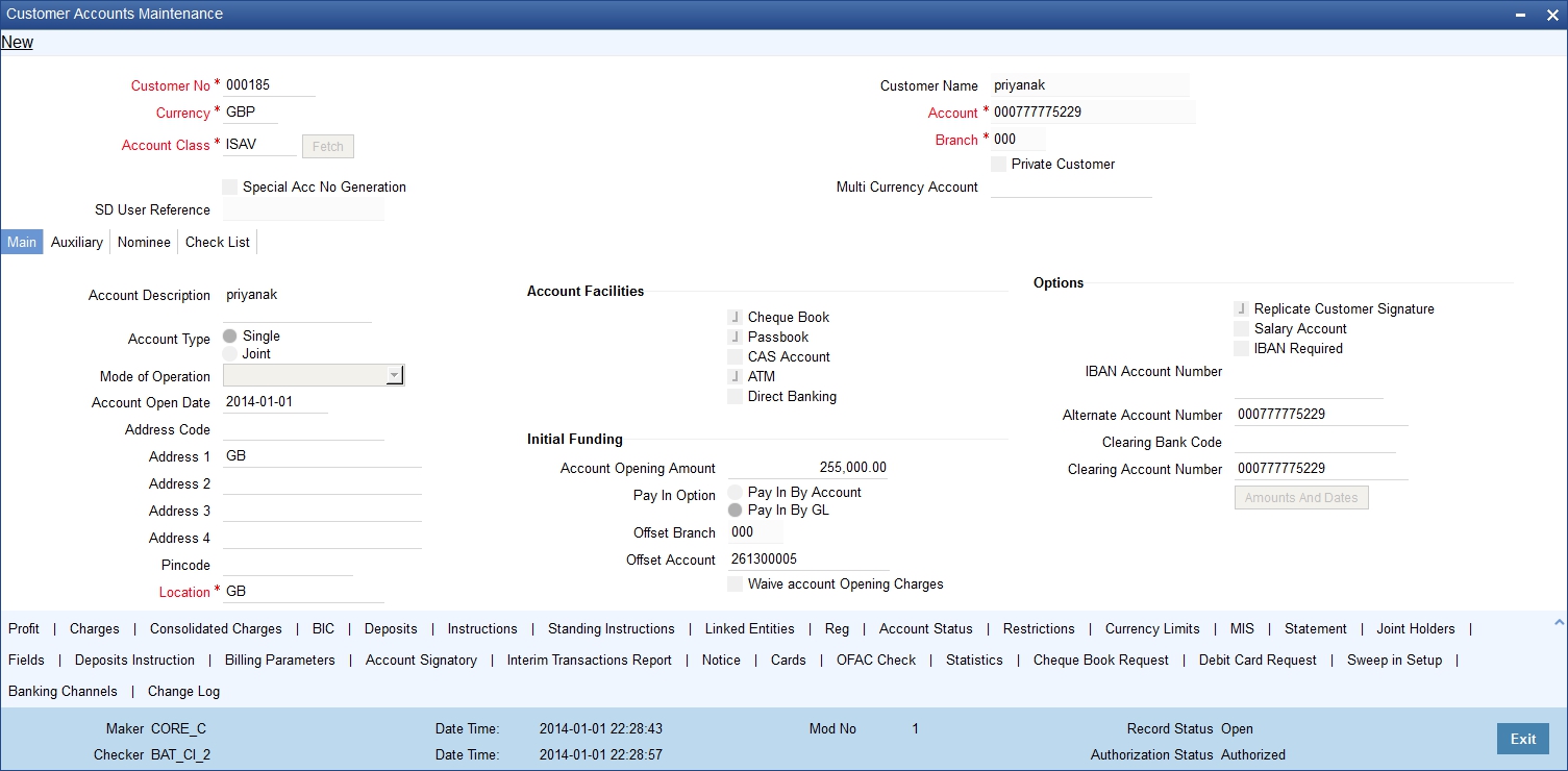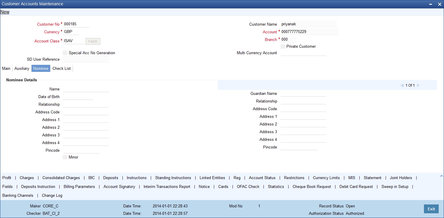The primary party change will be effected and updated in the customer account records only after authorization. During authorization, the system will repeat the validations. If there is any error, then you will not be allowed to authorize the record.
