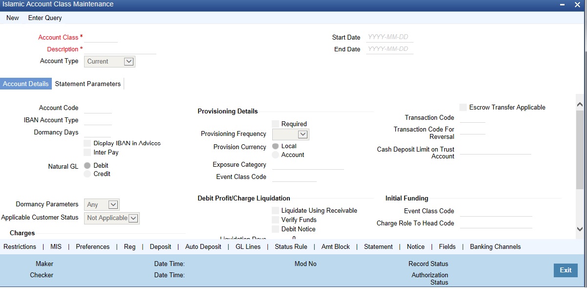 Defining Islamic Account Class includes the maintenance of the following parameters: