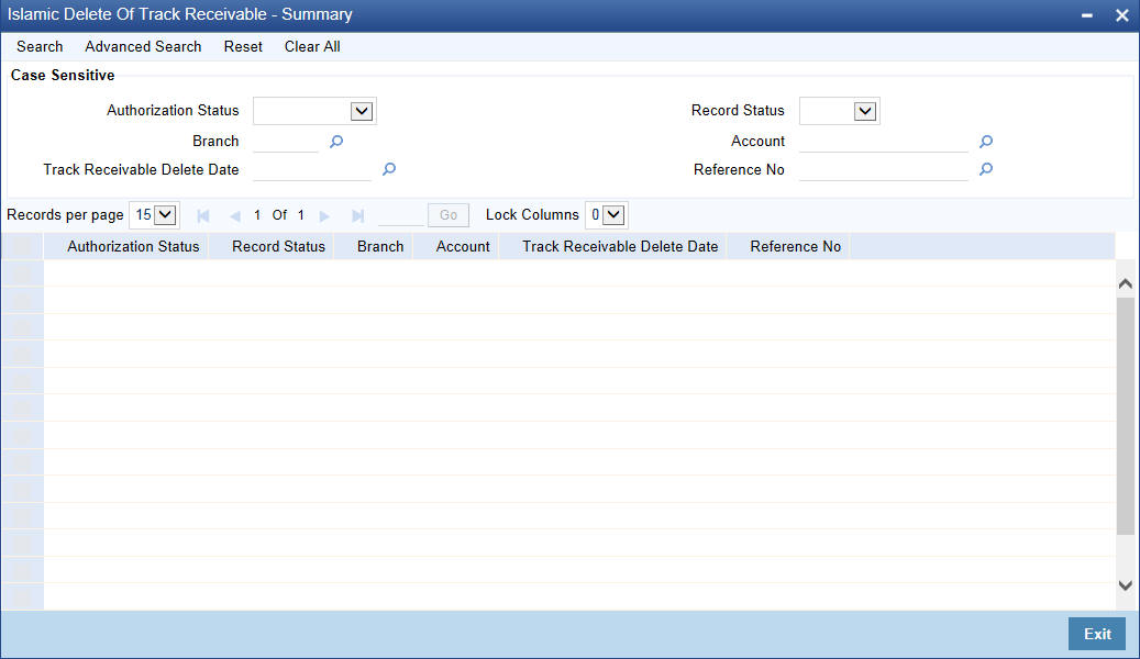 The Delete Track Receivable screen allows you to manually delete track receivable records. Delete Track Receivable is supported only for modules like ‘CL’, ‘CI’, ‘MO’ and ‘LE’. These modules will be modified to fetch records in RT, CG, DD, UP and IC modules. The first level of authorisation for deletion of Track Receivable must be done through STDTRKDL function ID for normal accounts and IADTRKDL for islamic accounts only.