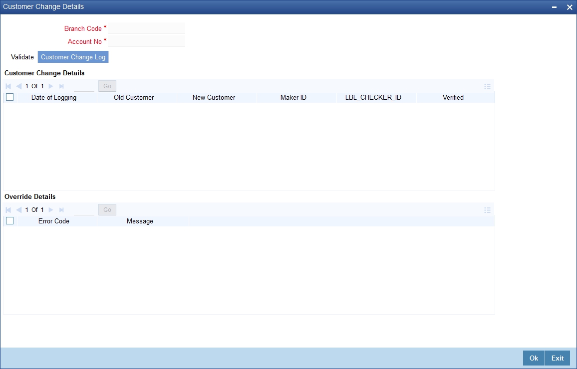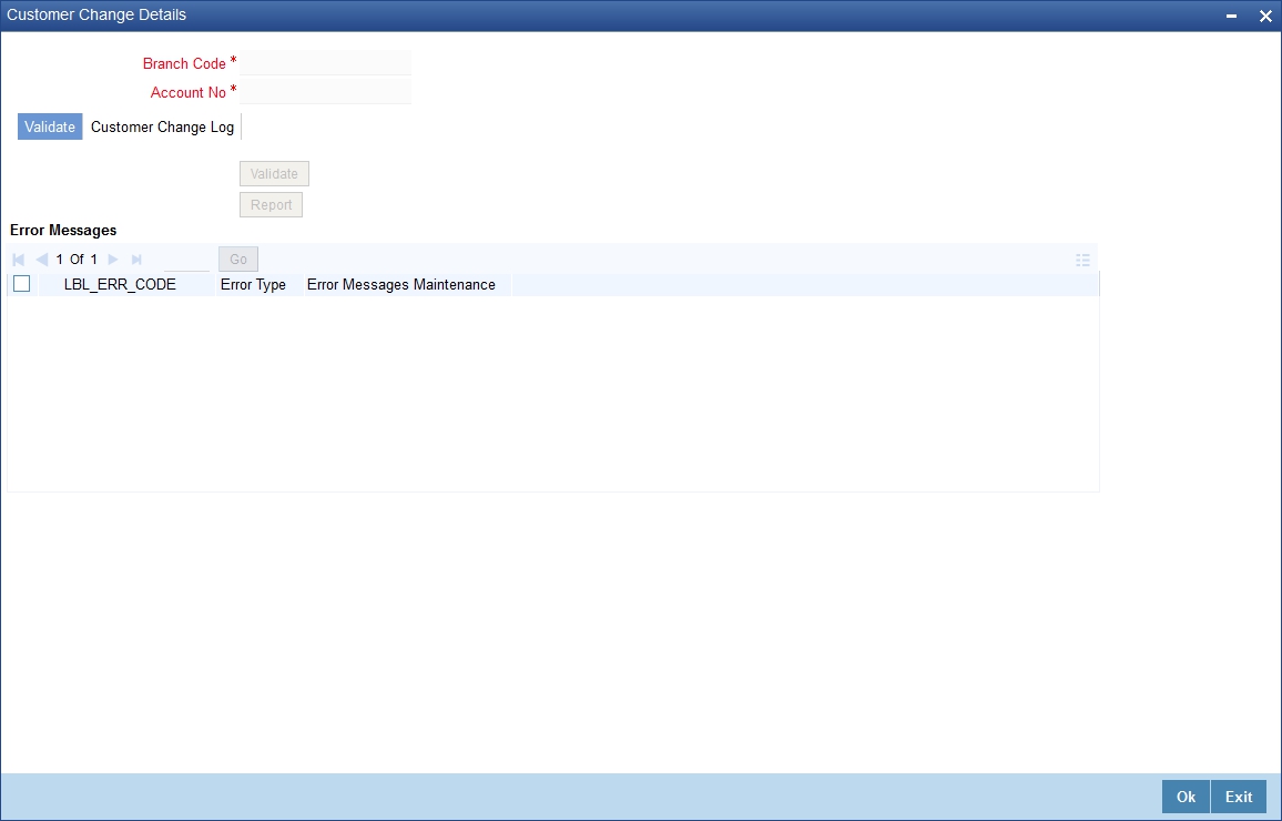 From the ‘Validate’ tab, you can validate the customer changes and view the error/override messages. Click ‘Validate’ button. The system will displays the following details if there is a possible error or override during the process.