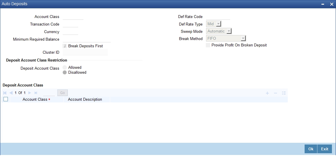 For creating an auto deposit, you have to specify an account class of the deposit. The tenor and profit conditions maintained for the selected account class will be defaulted.