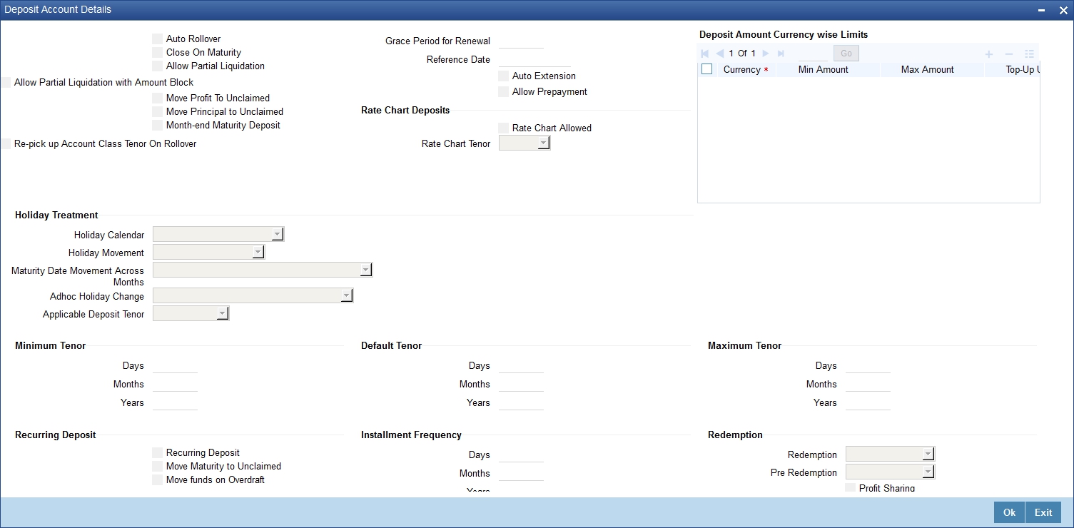 Click the ‘Deposit’ button to define the parameters for a deposit type account class. The ‘Deposit Account Details’ screen will be displayed.