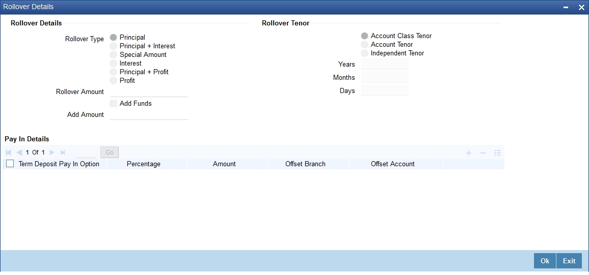Select the Payin Details for debiting the additonal amount for rollover from the drop down list. The list displays the following values: