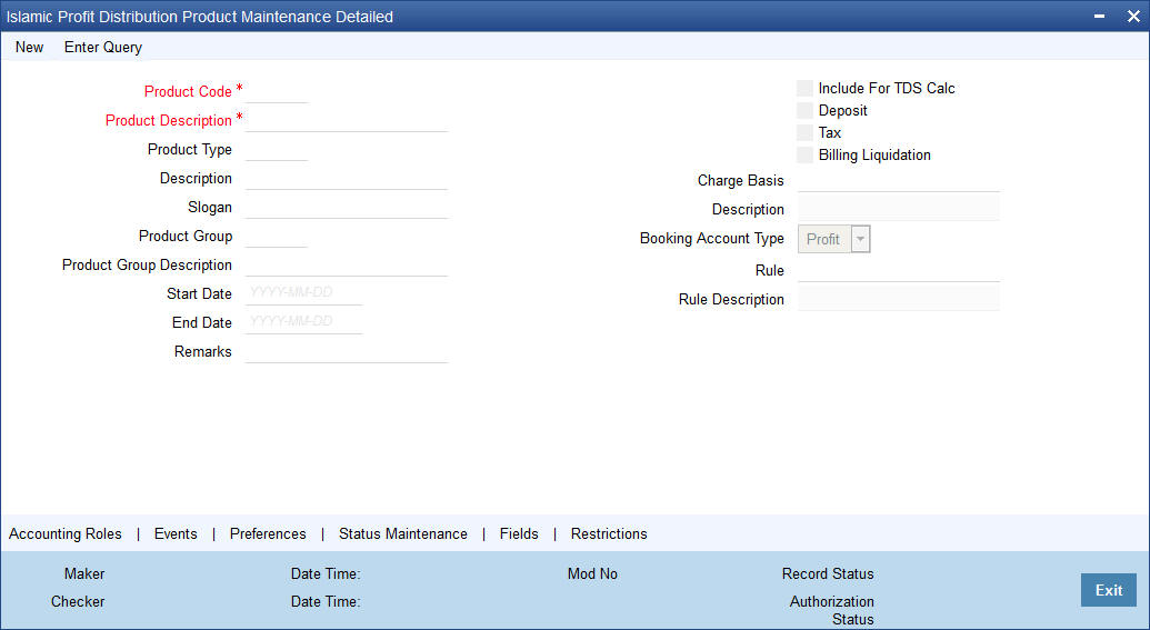 You need to set up a Profit/Charge product to handle the calculation of profit and charges on a TD. You can set up a product using the ‘Islamic Profit Distribution Product Maintenance’ screen, invoked from the Application Browser. You can invoke the ‘Islamic Profit Distribution Product Maintenance’ screen by typing ‘IADPRMNT’ in the field at the top right corner of the Application tool bar and clicking the adjoining arrow button.