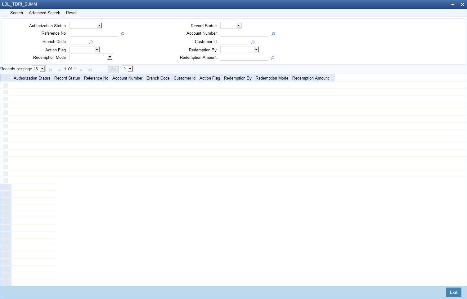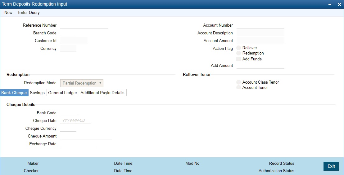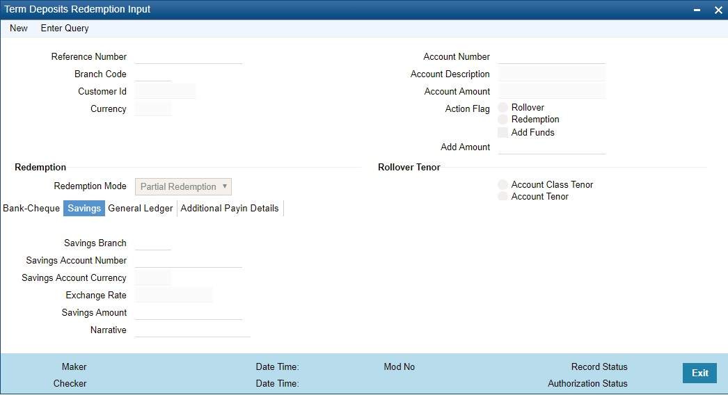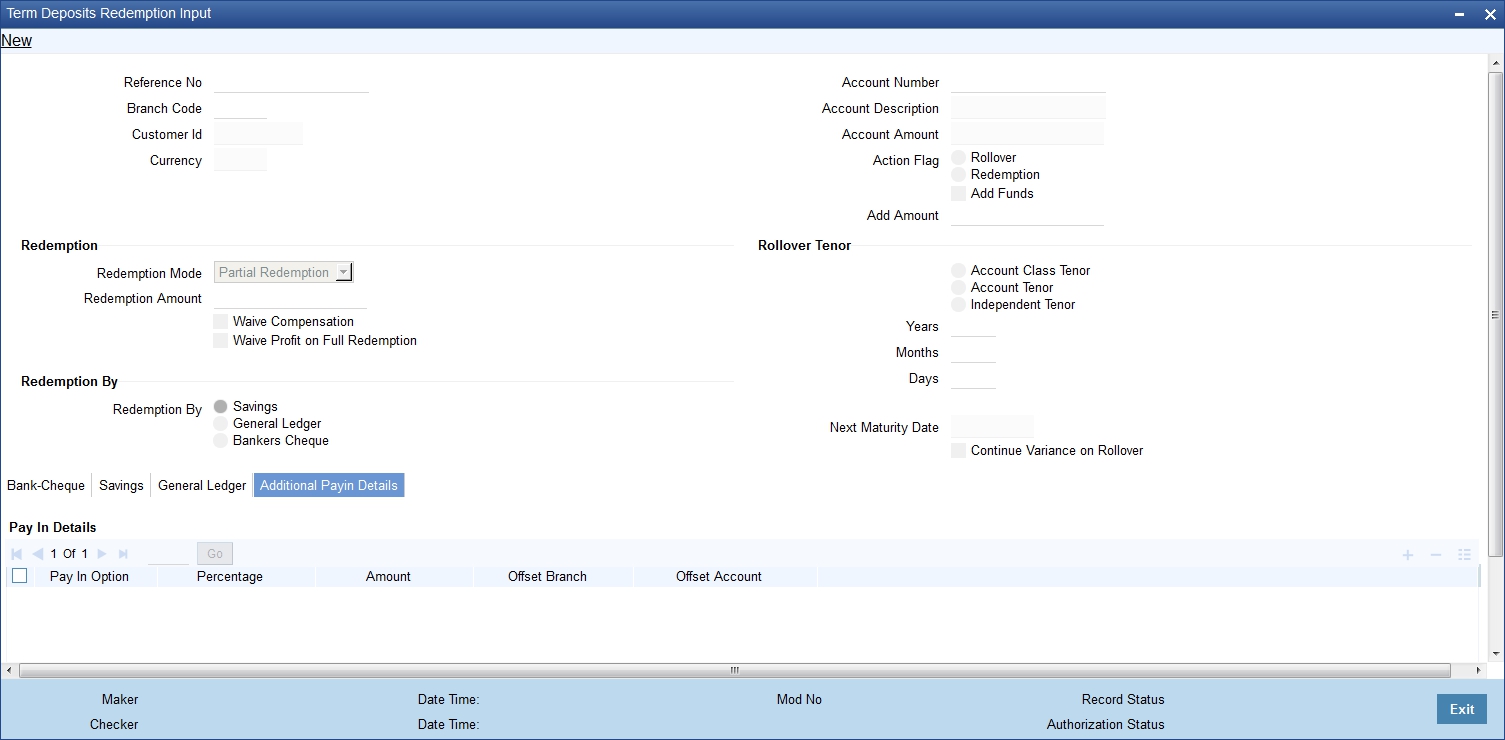 The redemption option enables you to redeem a term deposit. Using this option, you can do a premature redemption, either in full or in part and also complete redemption on maturity of the deposit. This screen also allows you to renew the TD. However, renewal of the TD is enabled only if you have specified ‘Grace period for Renewal’ option for the account.