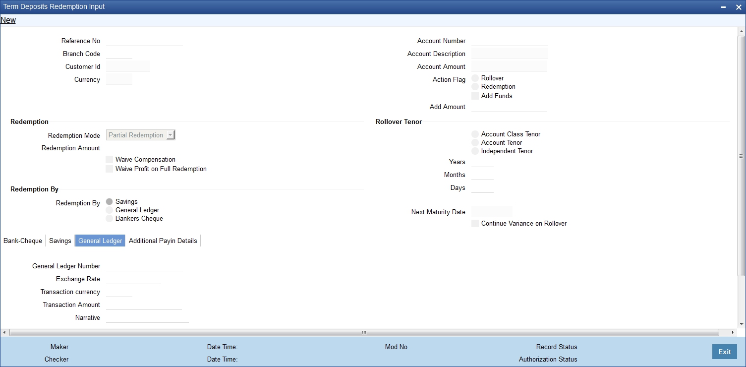 If you have indicated the means of redemption as ‘General Ledger’, then click the ‘General Ledger’ tab on the ‘Term Deposits Redemption Input’ screen.