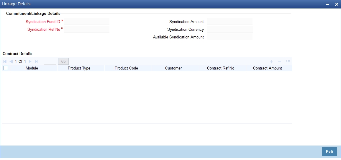 Syndication fund is associated to various financing transactions. The system enable you to view the linkage details associated with the syndication fund in the linkage details screen. Click ‘Linkage’ button on the ‘Islamic Finance Syndication’ screen to invoke ‘Linkage Details’ sub screen.