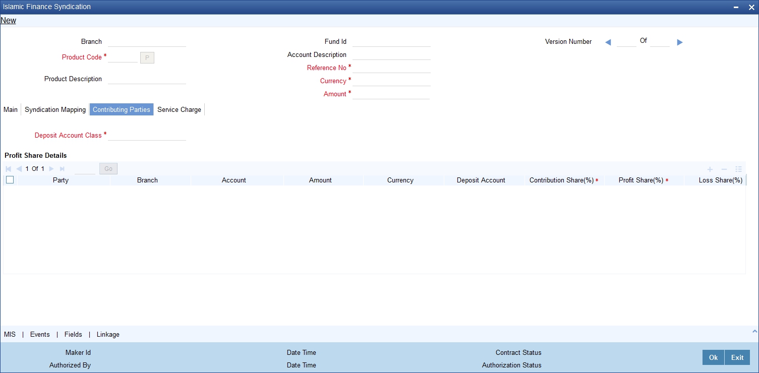 Fund pooled by the contributors is equal to the syndication amount. That is, the sum of the contributors’ share is equivalent to the syndication amount. You can track the amount contributed by the individual party through a deposit account, created during EOD as part of capital subscription batch. You can maintain the details related to contributing parties under ‘Contributing Parties’ Tab. Click ‘Contributing Parties’ tab on ‘Islamic Syndication Fund’ screen.