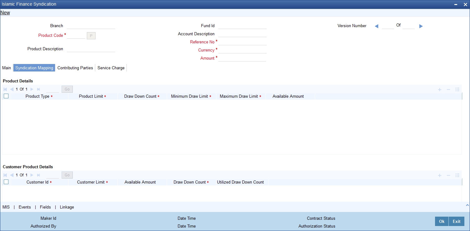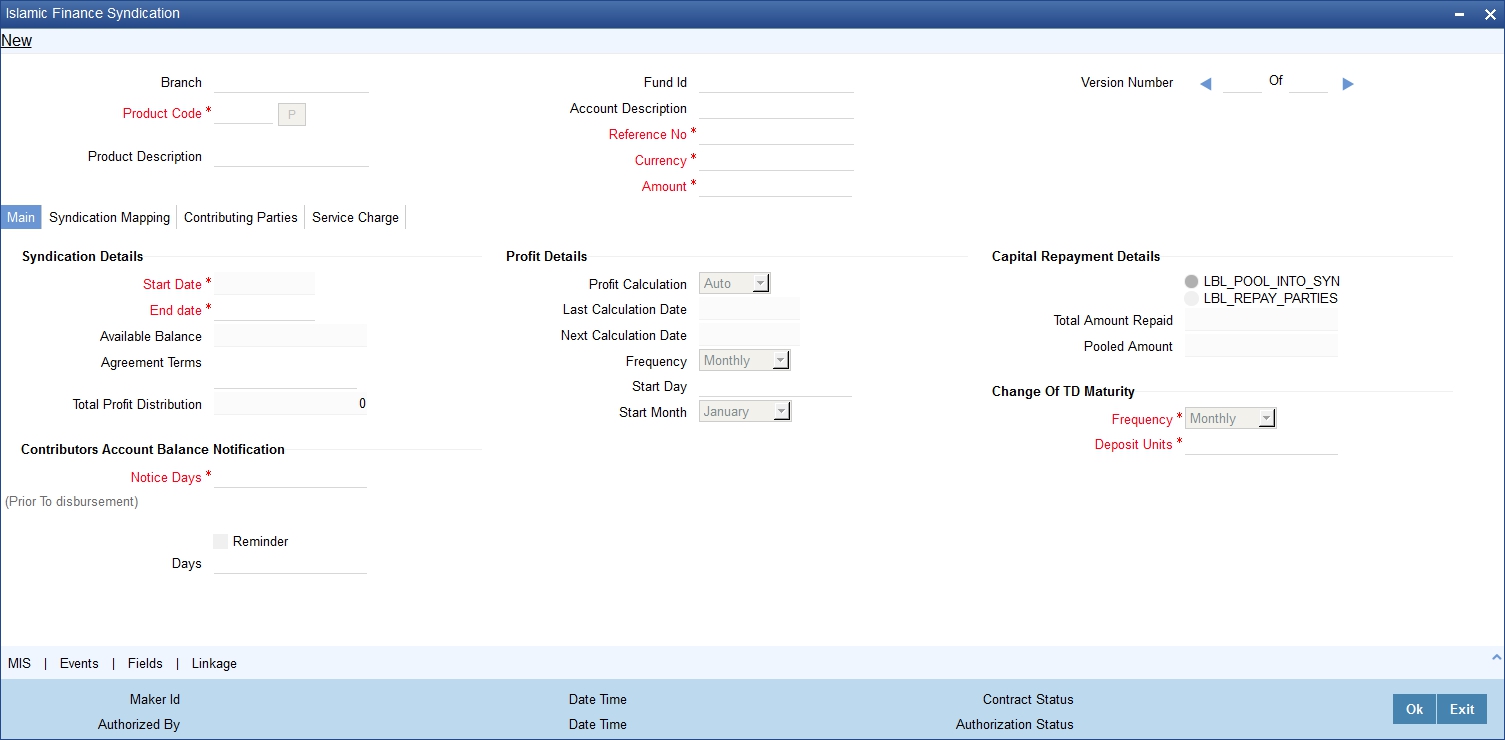 The additional information related to Islamic syndication fund is maintained in ‘Main’ tab. Click on the ‘Main’ tab to maintain additional information.