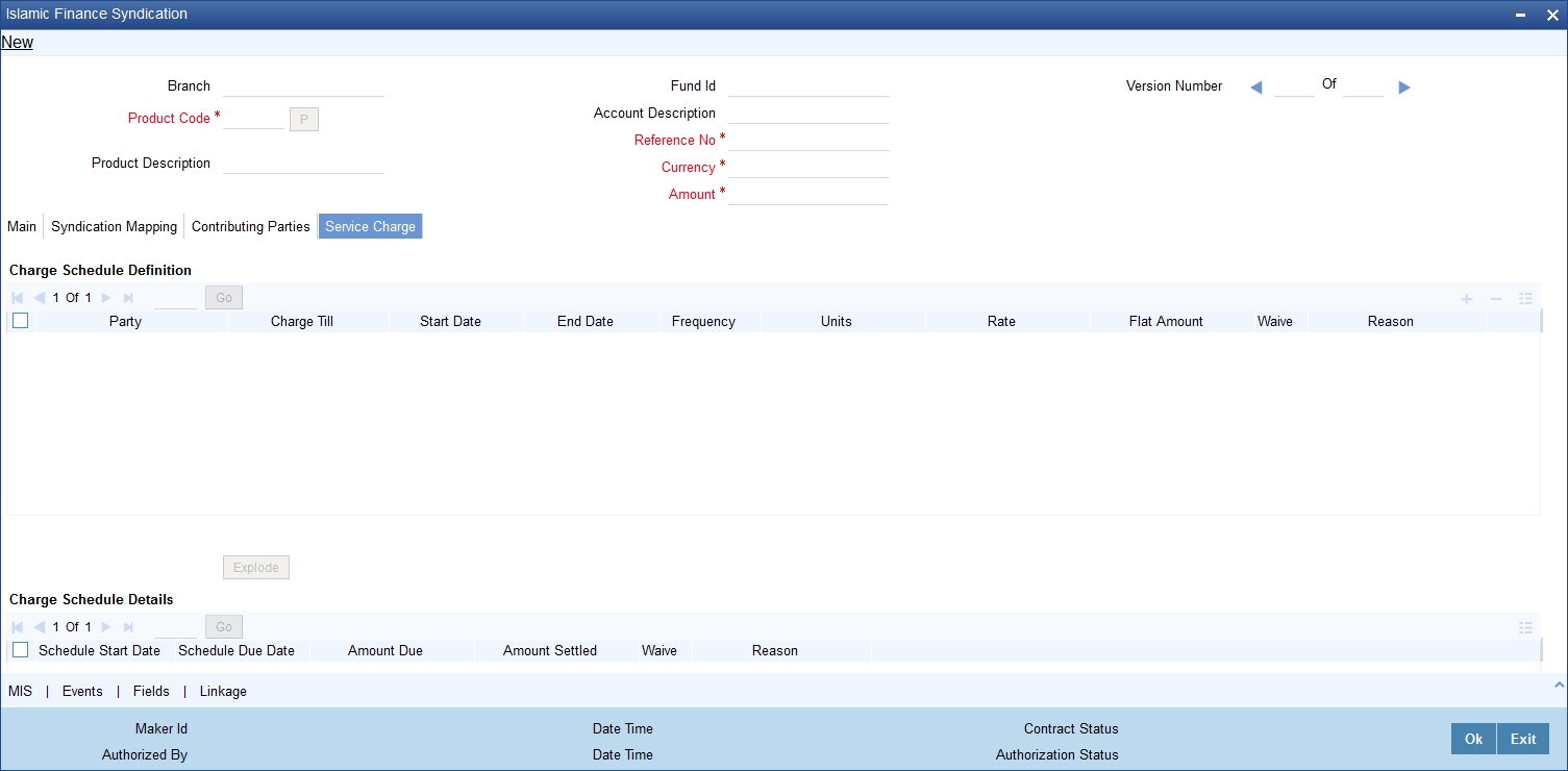 Based on the predefined schedule, all the contributing parties pay service charge to the bank for their share of contribution. Charge schedule is maintained for individual contributing parties involved in the syndication fund. You can define charge schedule and compute the charge schedule based on the definition under ‘Services Charge’ tab. Click ‘Services Charge’ tab to maintain service charge details.