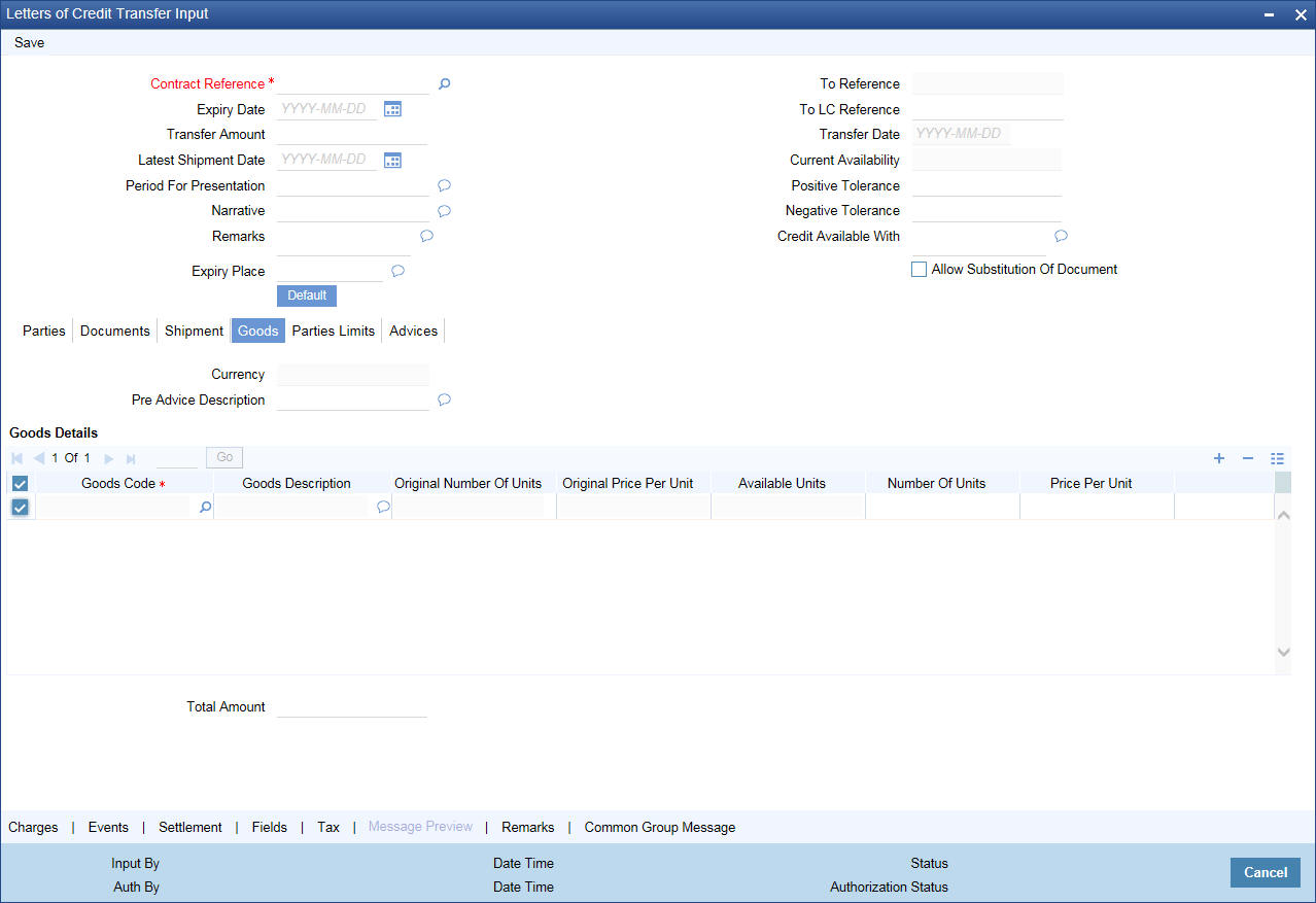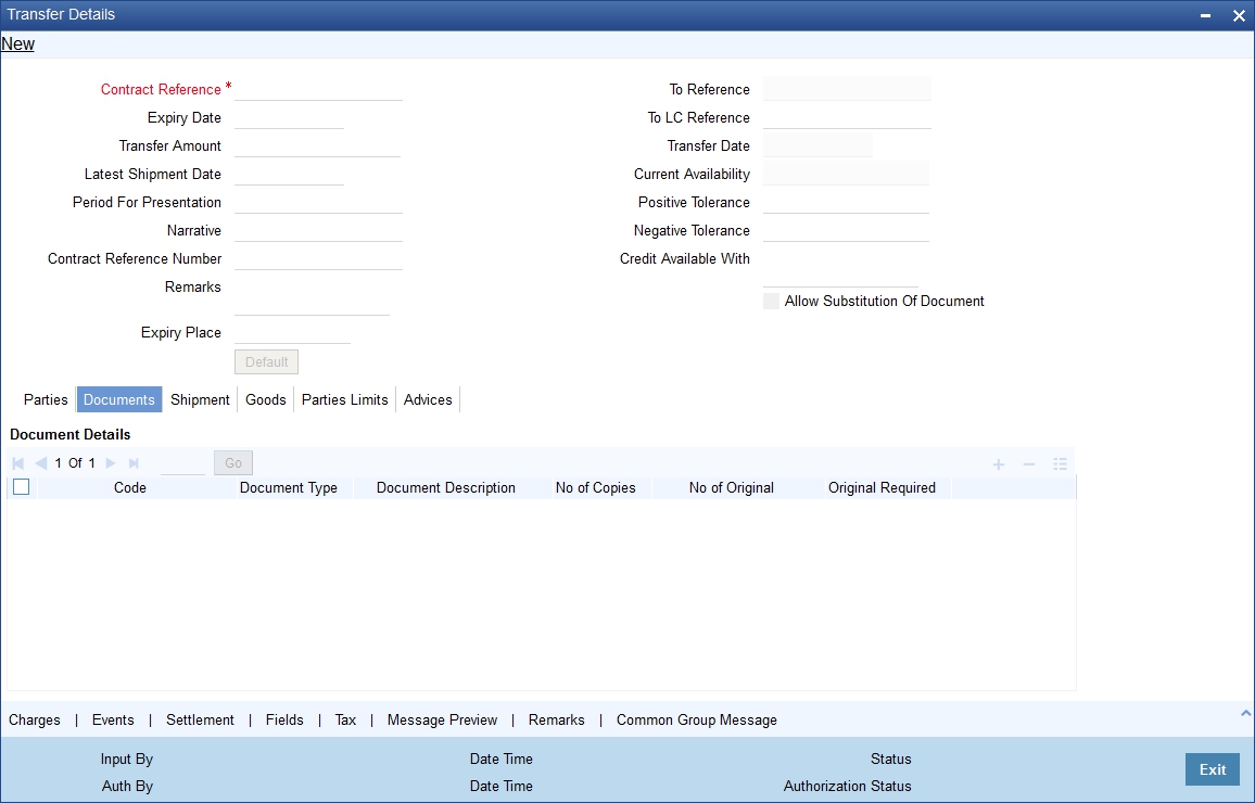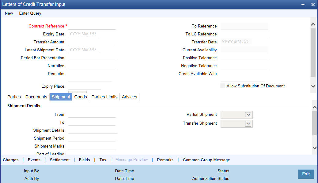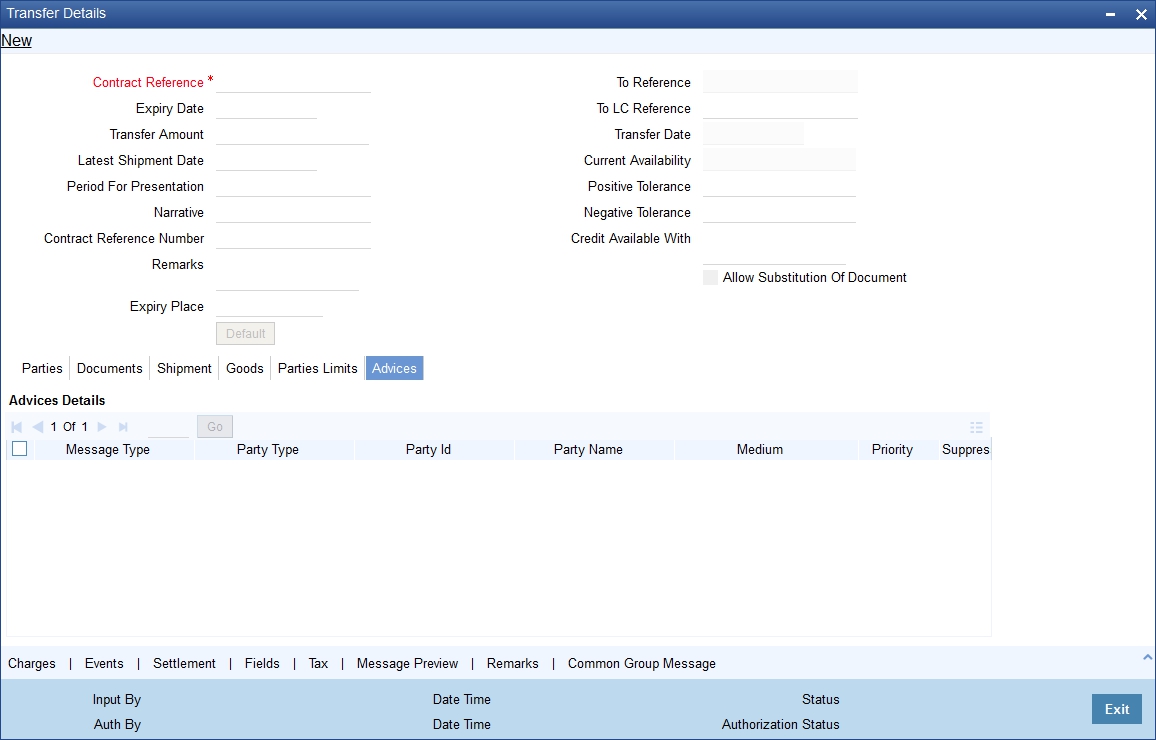 Specify the following details in the ‘Letters of Credit Transfer Input’ screen.
