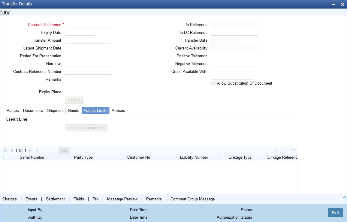 You can track the limits of multiple credit lines while transferring an LC contract. Click ‘Parties Limit’ tab on ‘Letters of Credit Transfer Input’ screen.