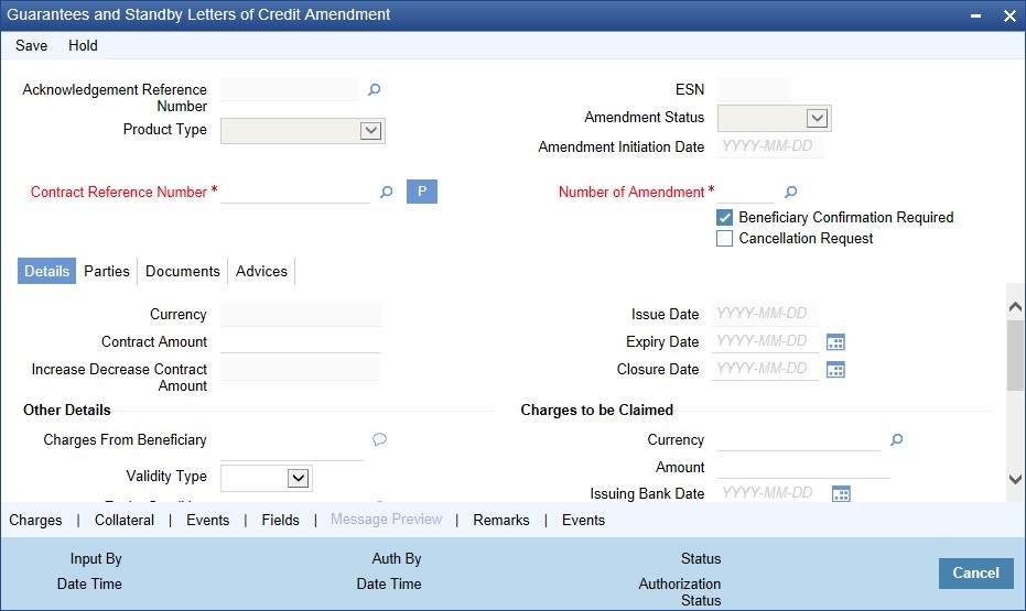 You can process Guarantees and SBLC contract using ‘Guarantees and Standby Letters of Credit Contract Input’ screen. The system processes SBLC from Guarantee screens if SWIFT 2019 is enabled.You can invoke this screen by typing ‘LCDGUONL’ in the top right corner of the Application toolbar and clicking the adjoining arrow button.