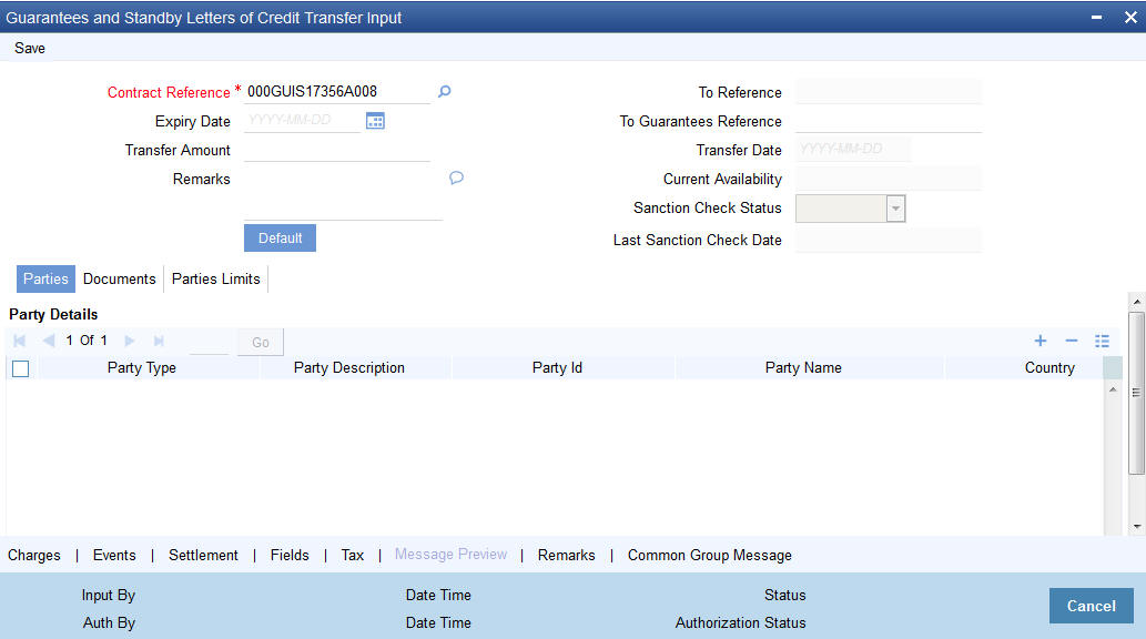 For more details on the tabs and buttons in Guarantees and SBLC Transfer Input screen, refer the chapter titled ‘Transferring LC’ in this user manual.