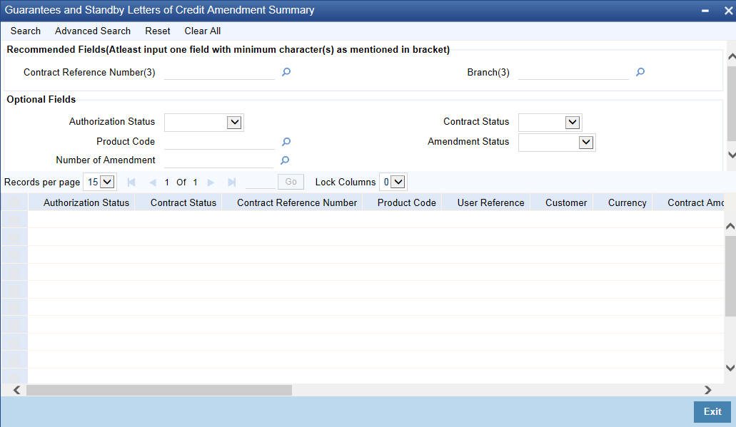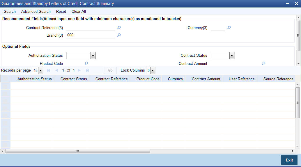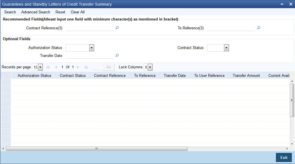 You can view guarantees and SBLC transfer details through ‘Guarantees and Standby Letters of Credit Transfer Summary’ screen. You can invoke this screen by typing ‘LCSGUTRF’ in the top right corner of the Application toolbar and clicking the adjoining arrow button.
