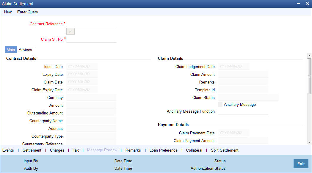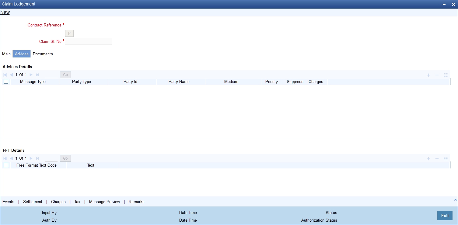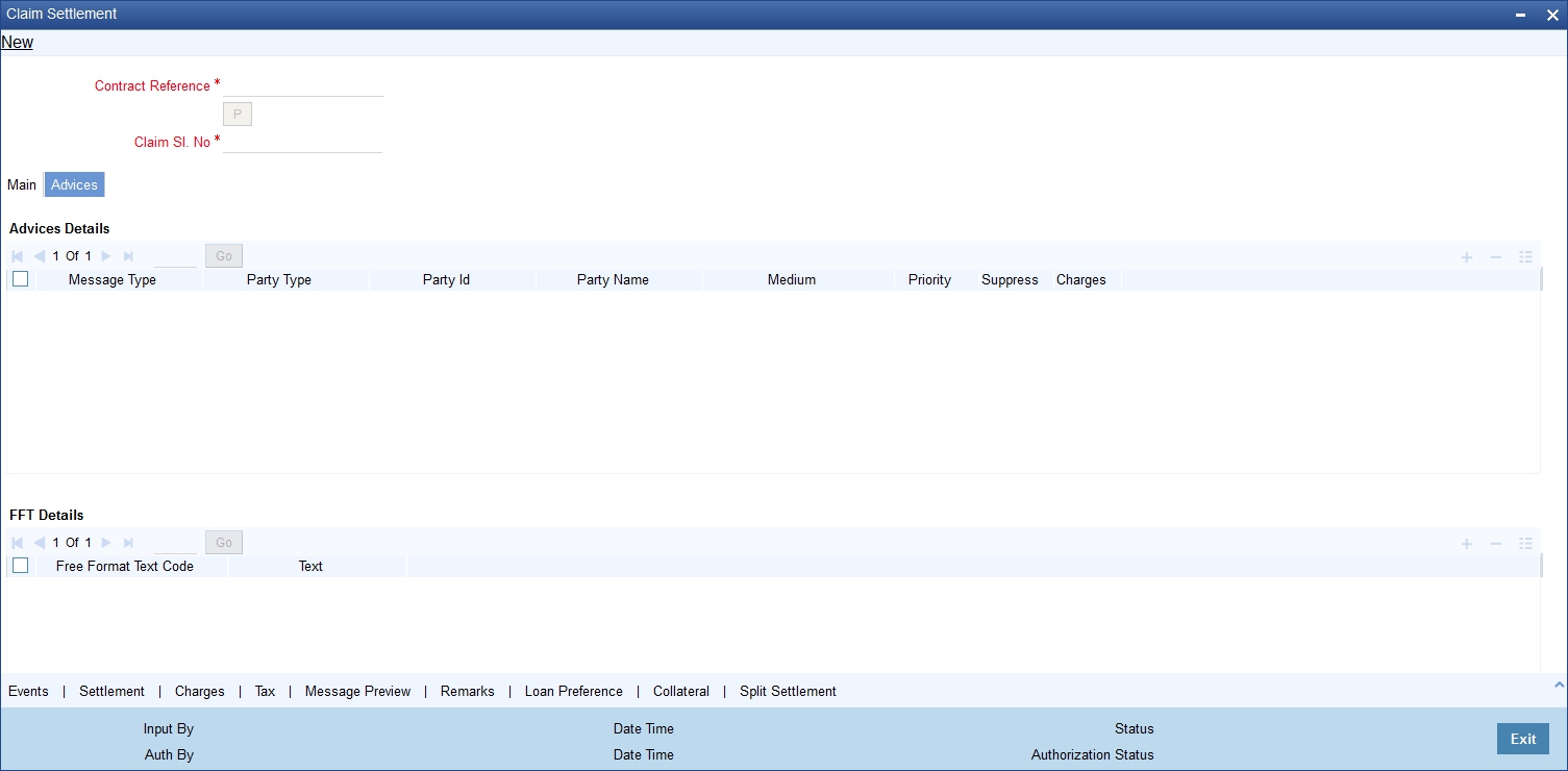 You can invoke the ‘Claim Settlement’ screen by typing ‘LCDGCLP’ in the field at the top right corner of the Application tool bar and clicking the adjoining arrow button. Click New icon.