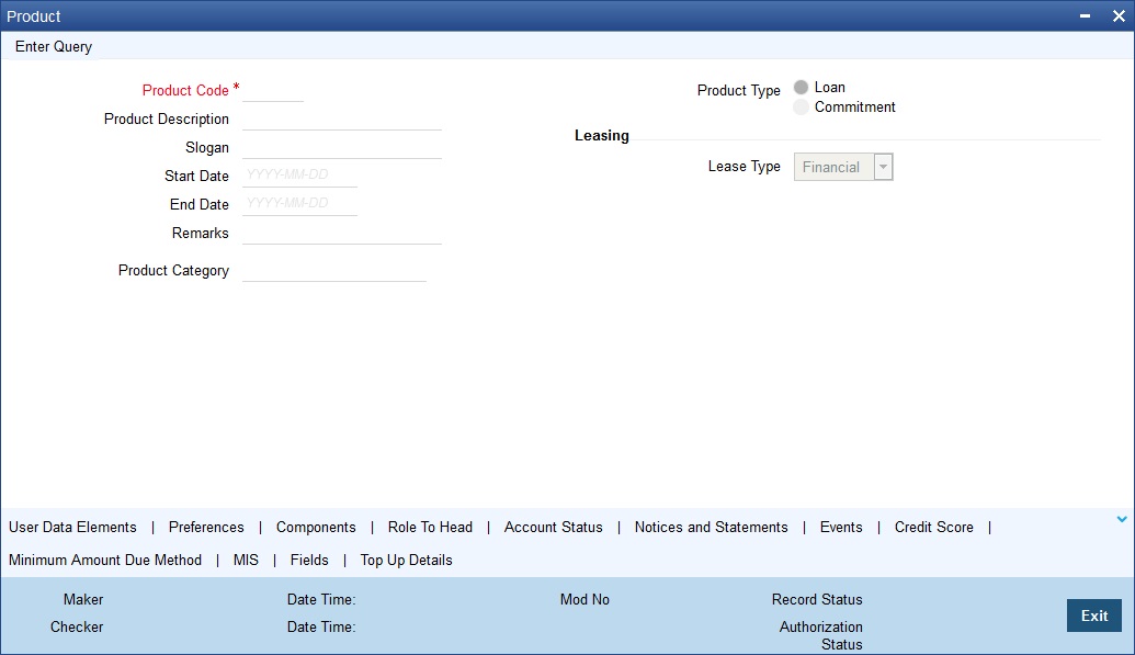 You can create a leasing product in the ‘Product’ screen, invoked from the Application Browser. In this screen, you can enter basic information relating to a lease product such as the Product Code, the Description, etc.