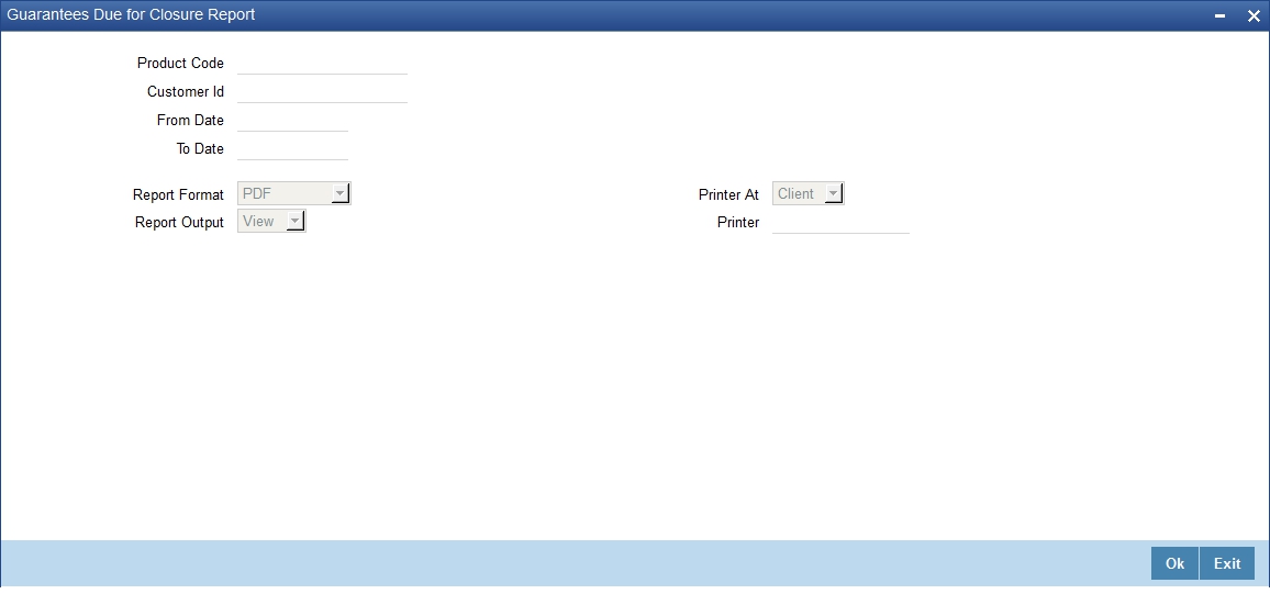 You can generate a report with the details of the guarantees that are due by using the ‘Guarantees Due for Closure Report’ screen. To invoke the screen, type ‘LIRPGUCL’ in the field at the top right corner of the Application tool bar and click the adjoining arrow button.