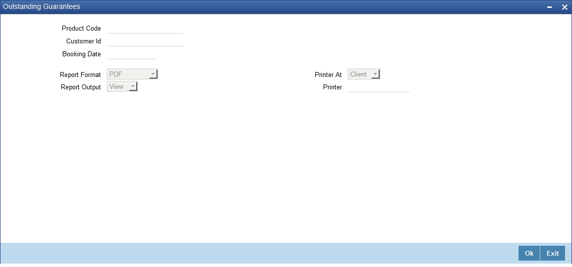 You can generate a report with the details of the guarantees that are outstanding by using the ‘Outstanding Guarantees’ screen. To invoke the screen, type ‘LIRPOGRP’ in the field at the top right corner of the Application tool bar and click the adjoining arrow button.