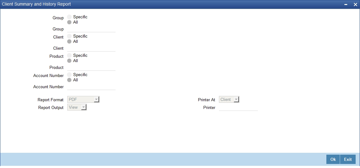 You can set your preferences as to the output of a report using ‘Client Summary and History Report’ screen. You can invoke this screen by typing ‘MFRACCNT’ in the field at the top right corner of the Application tool bar and clicking on the adjoining arrow button.
