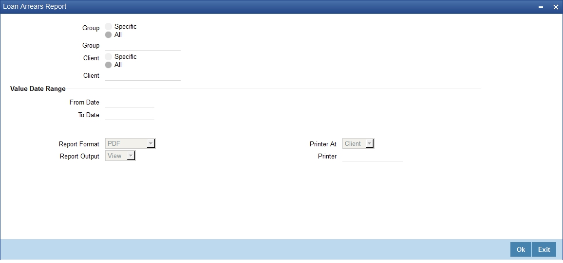 You can set your preferences as to the output of a report using ’Client Fees, Charges and Penalties Report’ screen. You can invoke this screen by typing ‘MFRCFPNT’ in the field at the top right corner of the Application tool bar and clicking on the adjoining arrow button.