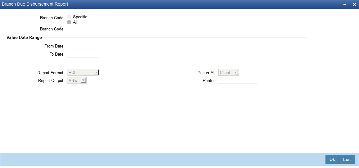 You can set your preferences as to the output of a report using ‘Branch Due Disbursement Report’ screen. You can invoke this screen by typing ‘MFRBRDNT in the field at the top right corner of the Application tool bar and clicking on the adjoining arrow button