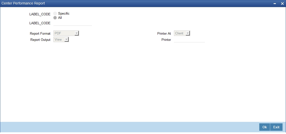 You can set your preferences as to the output of a report using ‘Center Performance Report’ screen. You can invoke this screen by typing ‘MFRCNPFM’ in the field at the top right corner of the Application tool bar and clicking on the adjoining arrow button.