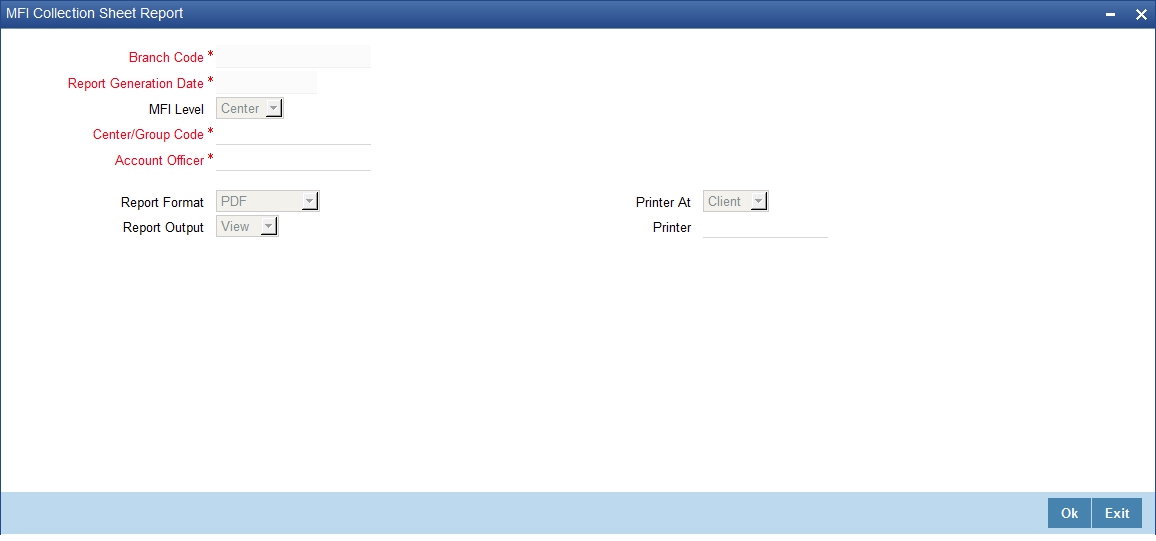 You can set your preferences as to the output of a report using ‘Collection Sheet’ screen. You can invoke this screen by typing ‘MFRCOLRP’ in the field at the top right corner of the Application tool bar and clicking on the adjoining arrow button.