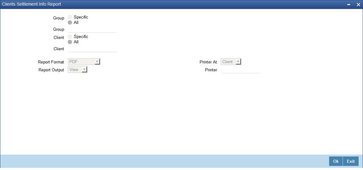 You can set your preferences as to the output of a report using ‘Clients Settlement info Report’ screen. You can invoke this screen by typing ‘MFRCSINT’ in the field at the top right corner of the Application tool bar and clicking on the adjoining arrow button.